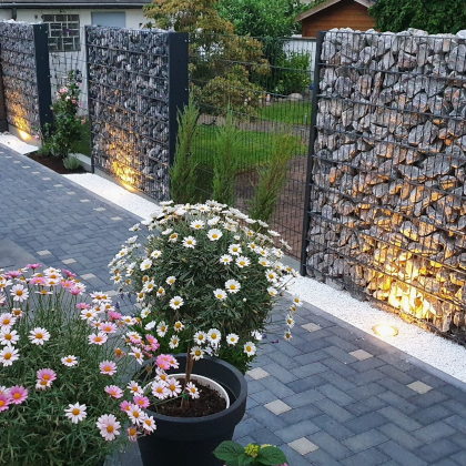 BLUMEN, STEINE, ZAUN, GABIONE, LICHT.