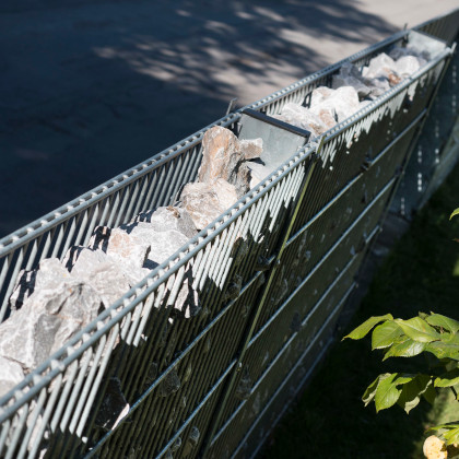 Alternativ zu der Variante mit den Pfostenblechen oben, besticht diese Gabionenvariante durch eine einfache Montage und ein besonderes lückenloses Bild. Nach Montage der parallel verlaufenden Gitter am Pfosten erhält man eine Breite zwischen den Zaunmatten als Füllvolumen von ca. 145 mm.