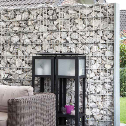 Dieses Gabionensystem mit Pfostenblechen ist ein sehr beliebtes architektonisches Stilelement und glänzt durch vielseitige Designs und Einsatzmöglichkeiten. Säulen und Steinfüllungen lassen sich individuell kombinieren. Die Doppelstabmatten in 8/6/8 - Stärke werden ganz simpel eingehangen und so entsteht in kürzester Zeit ein Gabionenzaun, der zusätzlich durch sein schlankes Design besticht. Der Kreativität sind keine Grenzen gesetzt: ein dekoratives Element im Außenbereich oder auch als Pfosten für Holzelemente, Doppelstab- oder Sichtschutzgitter.